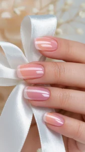 Practical elegance. Not every bride wants long extensions. This look celebrates the natural nail with a short, squoval shape and a sheer, glowing pink polish. It focuses on health and impeccable grooming rather than art.